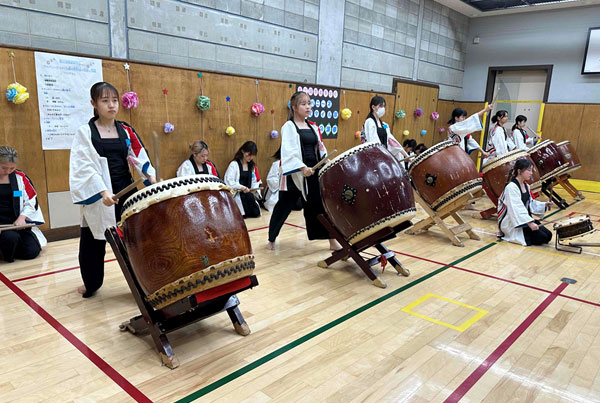 和太鼓、琴、三味線、笛で迫力ある創作演奏をしています。文化祭などでの発表に加え、国際交流イベントや児童館・小学校で留学生や児童の皆さんに演奏披露したり、和楽器の演奏体験をしてもらう企画も行っています。
